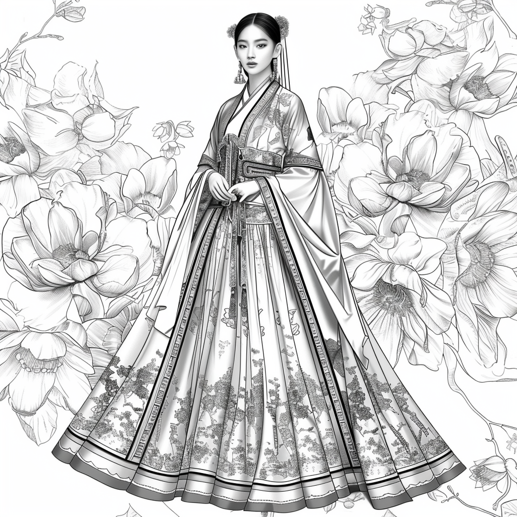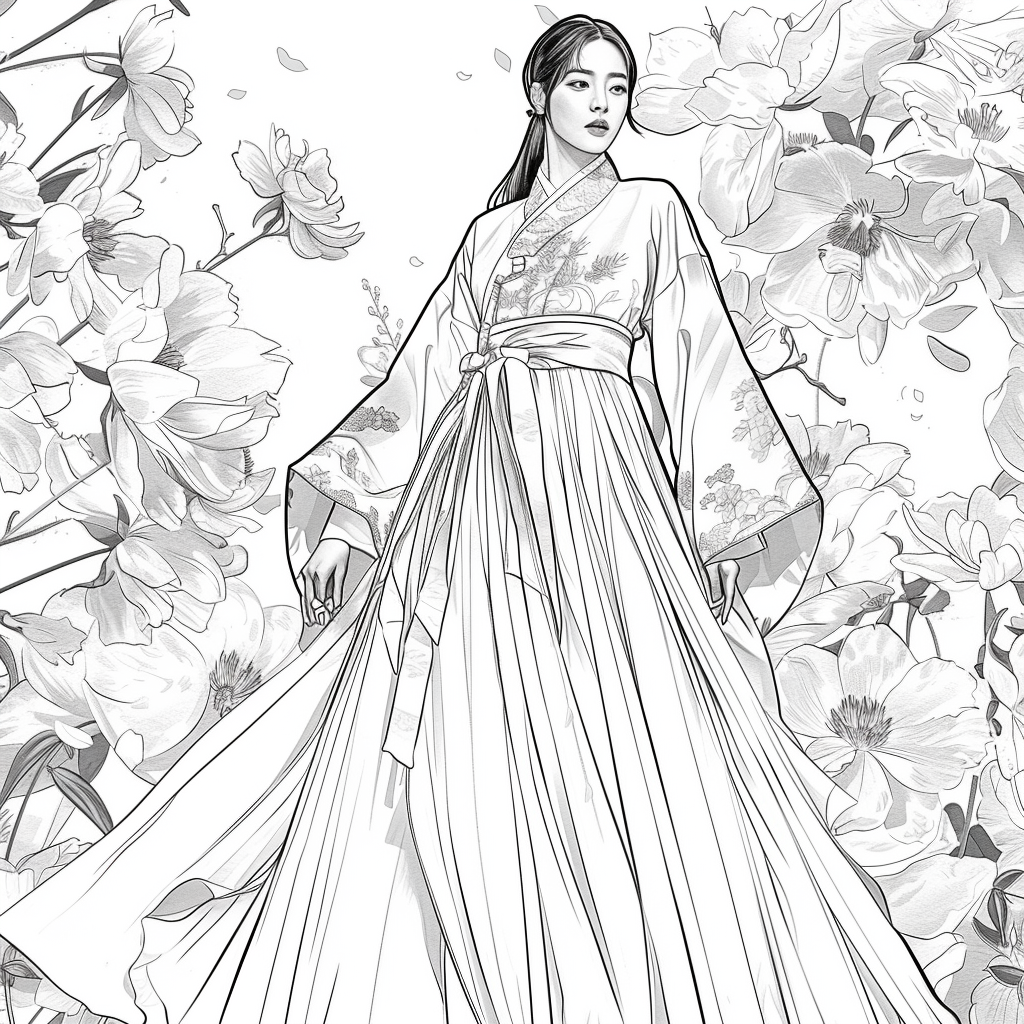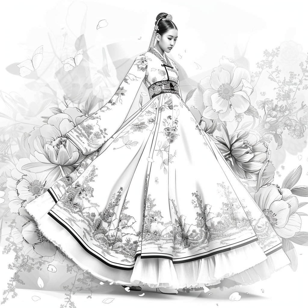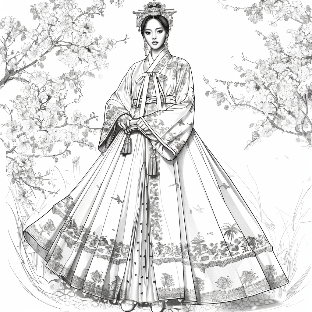 A poised woman draped in a luxurious hanbok of deep midnight blue, adorned with radiant floral embroidery, stands gracefully amidst an ethereal dreamscape. Her flowing gown shimmers with gradients of crimson, violet, and gold, echoing both nightfall and dawn. Behind her, delicate branches bloom with quiet elegance, their blossoms mingling with ink-like splashes and watercolor mists. The scene blends tradition with artistry, as if painted on a canvas where reality and fantasy dissolve into one—capturing the serene strength and poetic beauty of a timeless muse.