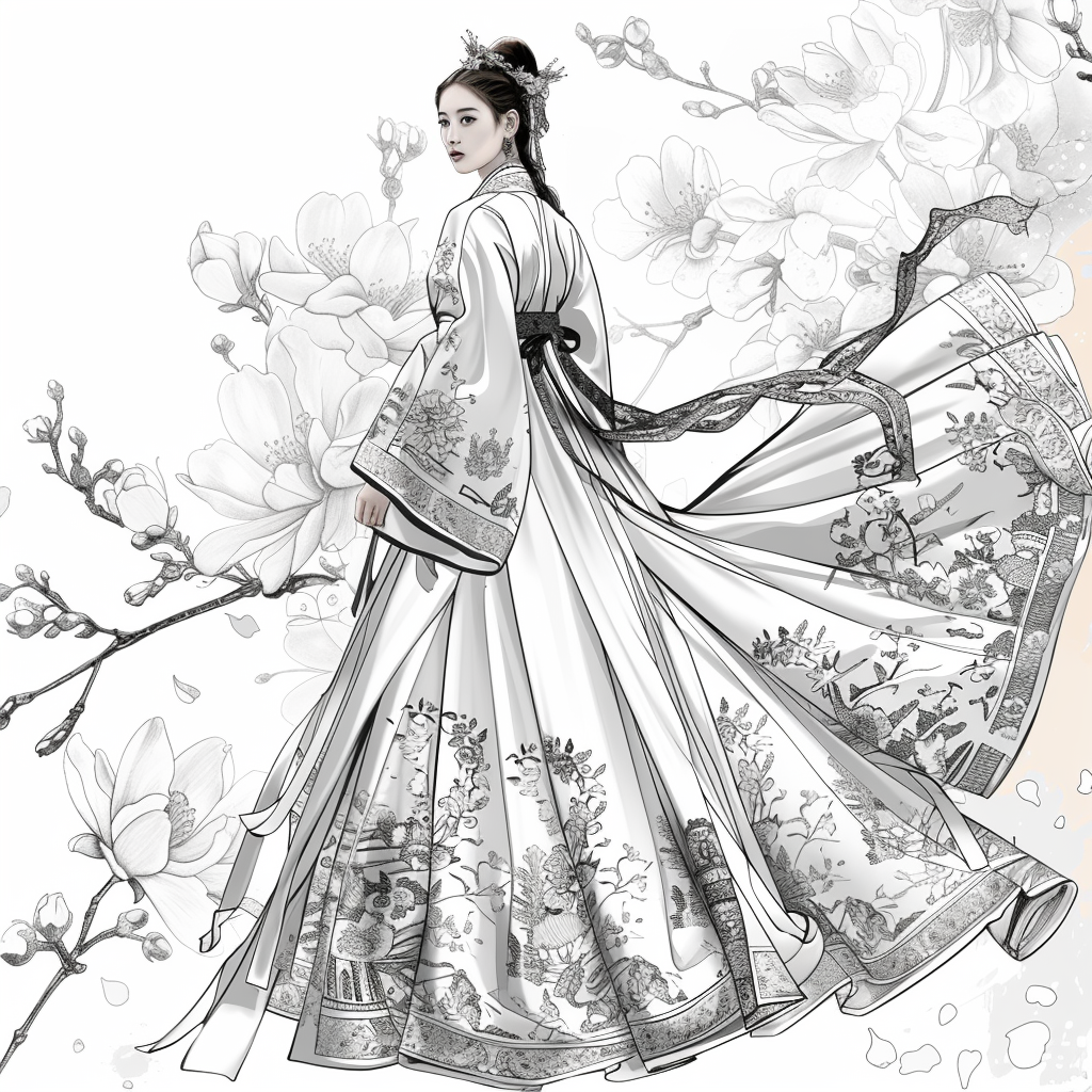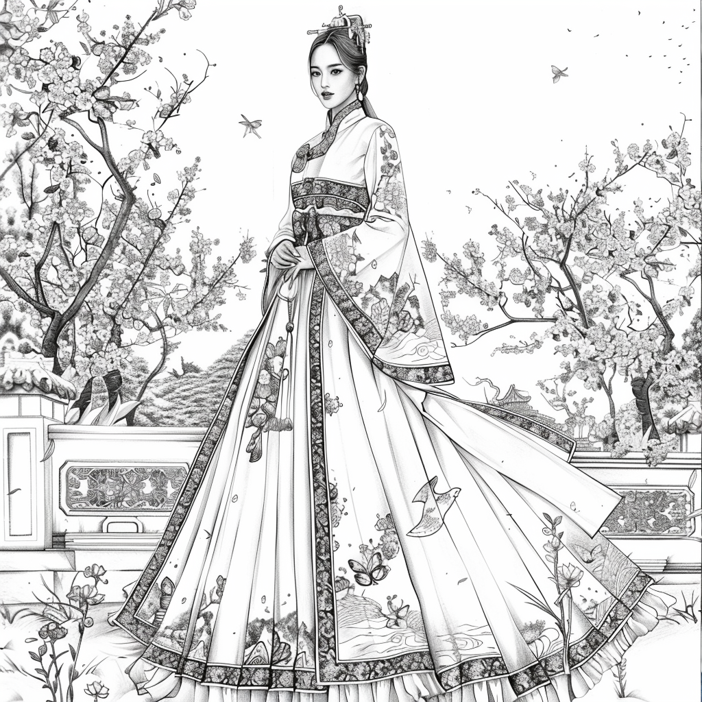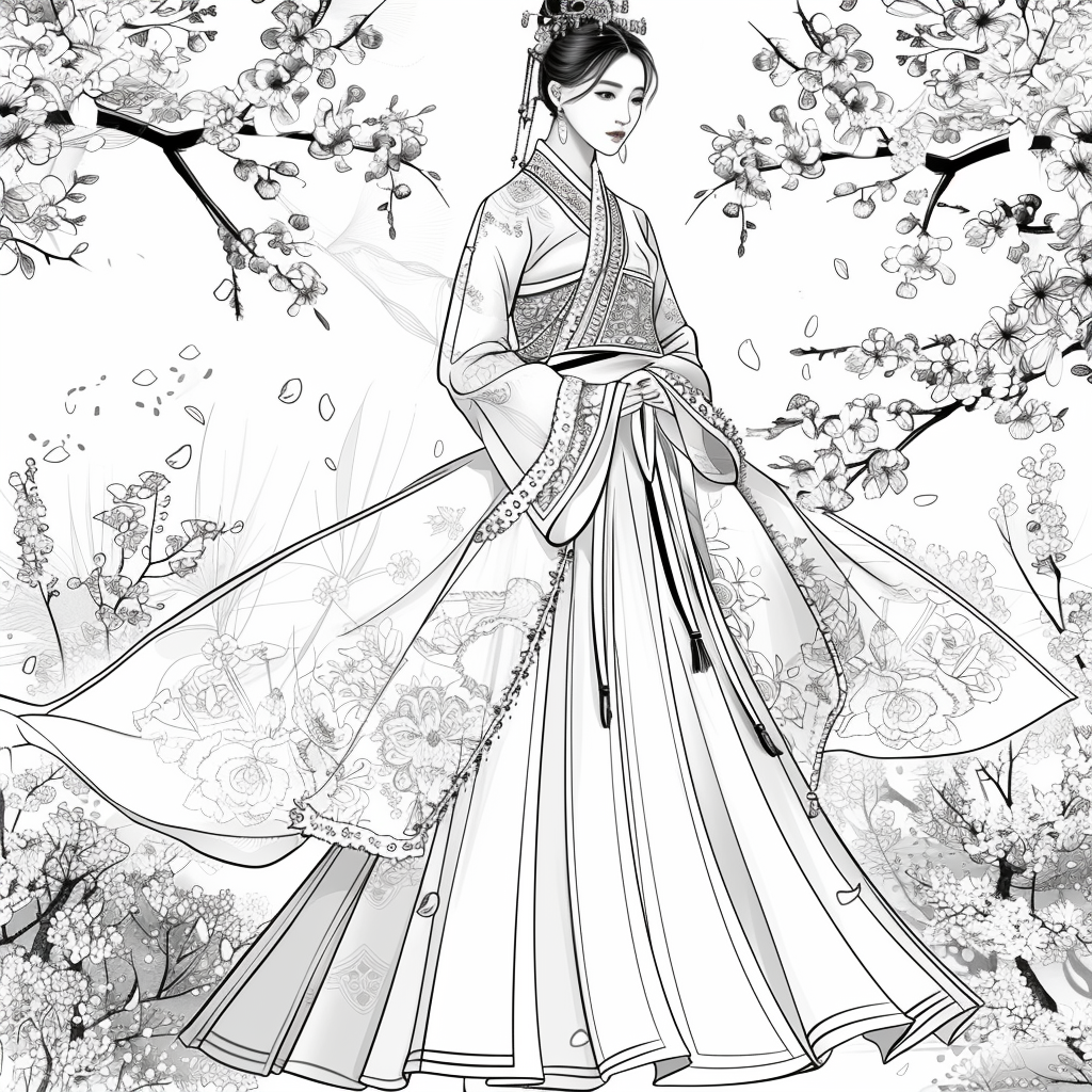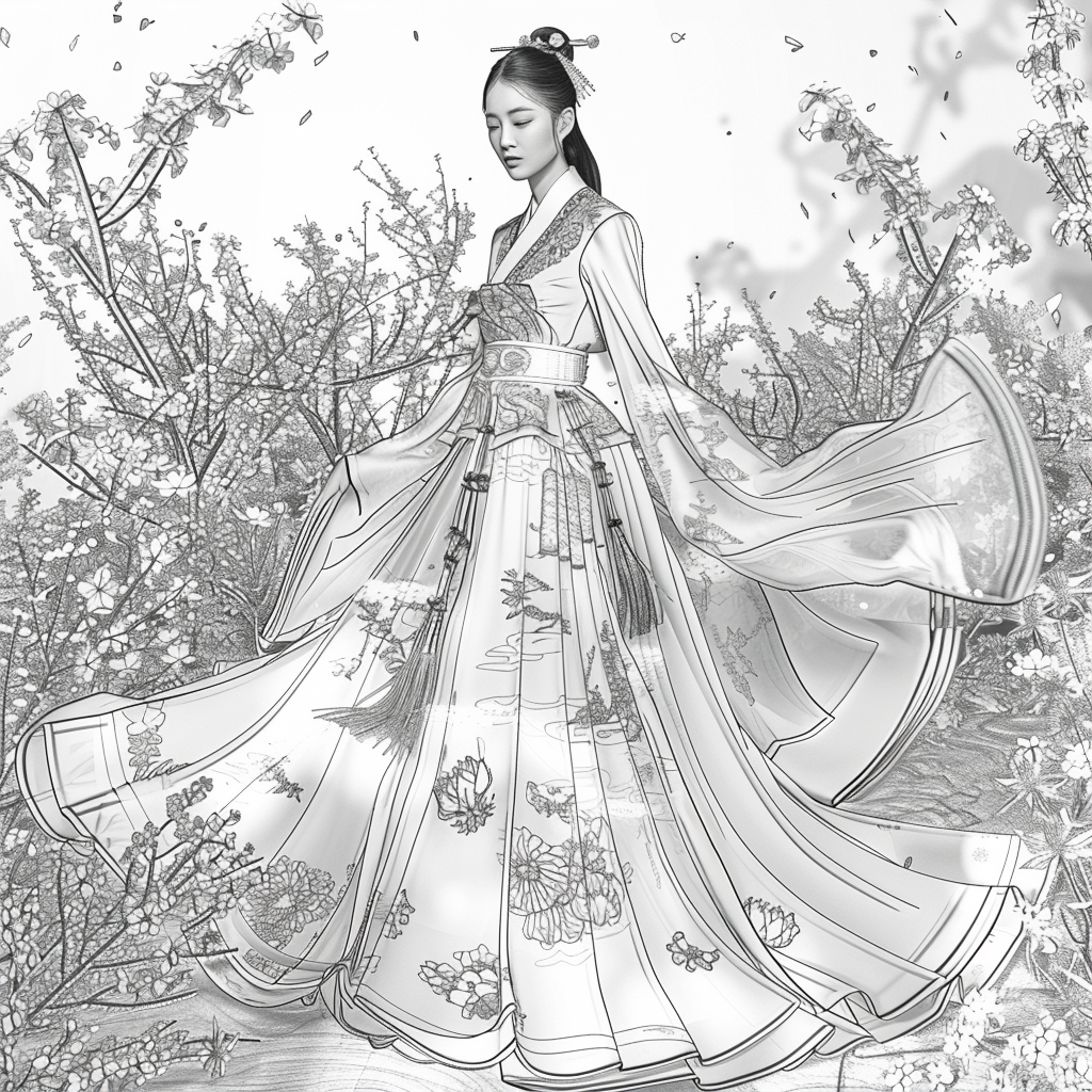 A poised woman draped in a luxurious hanbok of deep midnight blue, adorned with radiant floral embroidery, stands gracefully amidst an ethereal dreamscape. Her flowing gown shimmers with gradients of crimson, violet, and gold, echoing both nightfall and dawn. Behind her, delicate branches bloom with quiet elegance, their blossoms mingling with ink-like splashes and watercolor mists. The scene blends tradition with artistry, as if painted on a canvas where reality and fantasy dissolve into one—capturing the serene strength and poetic beauty of a timeless muse.