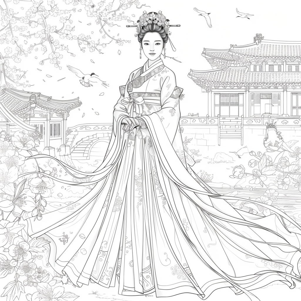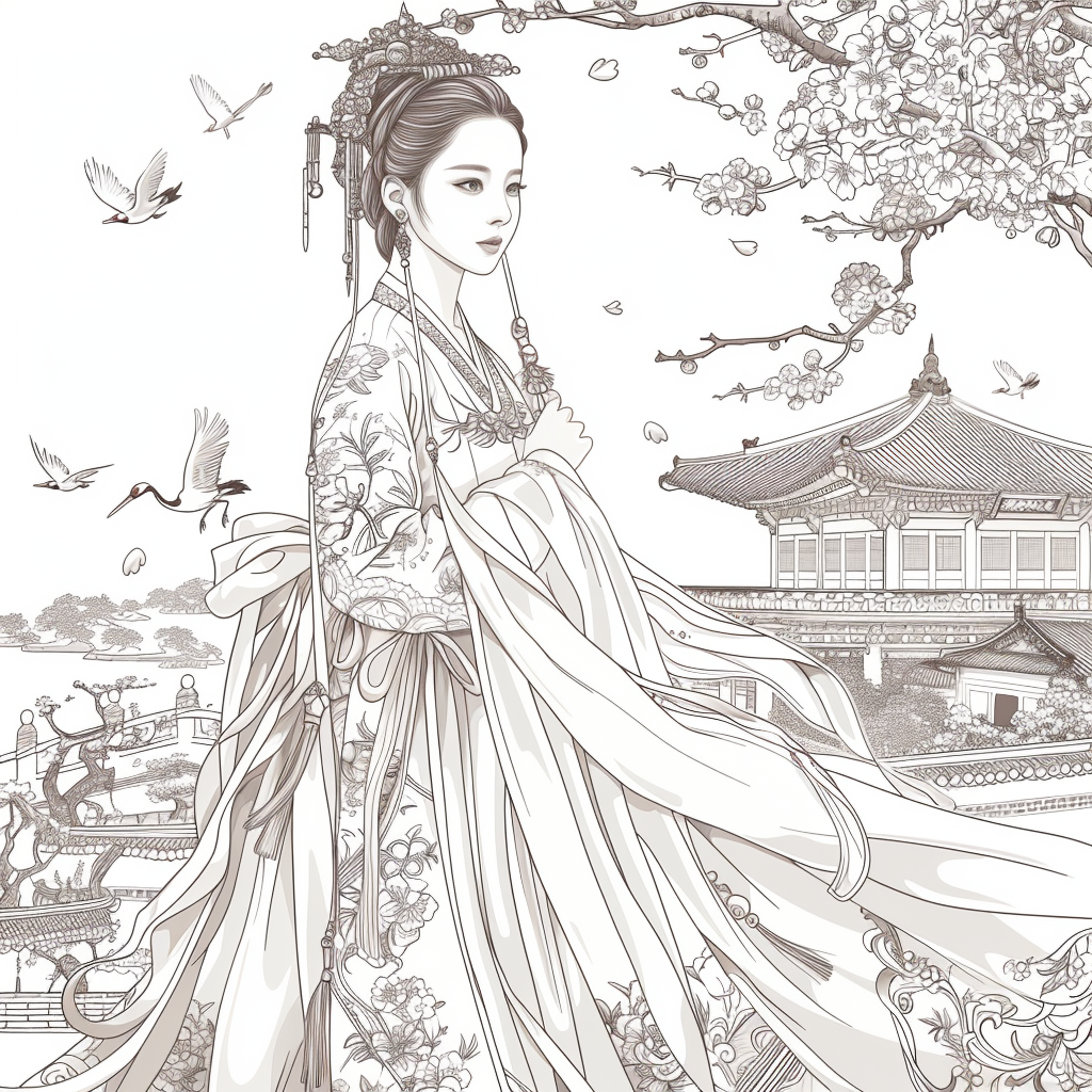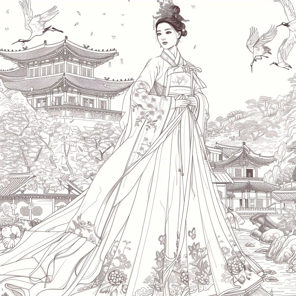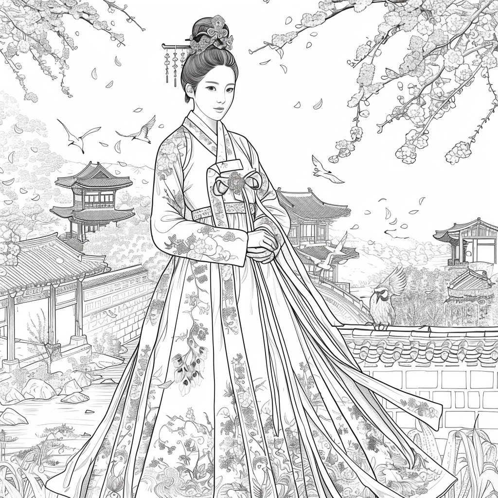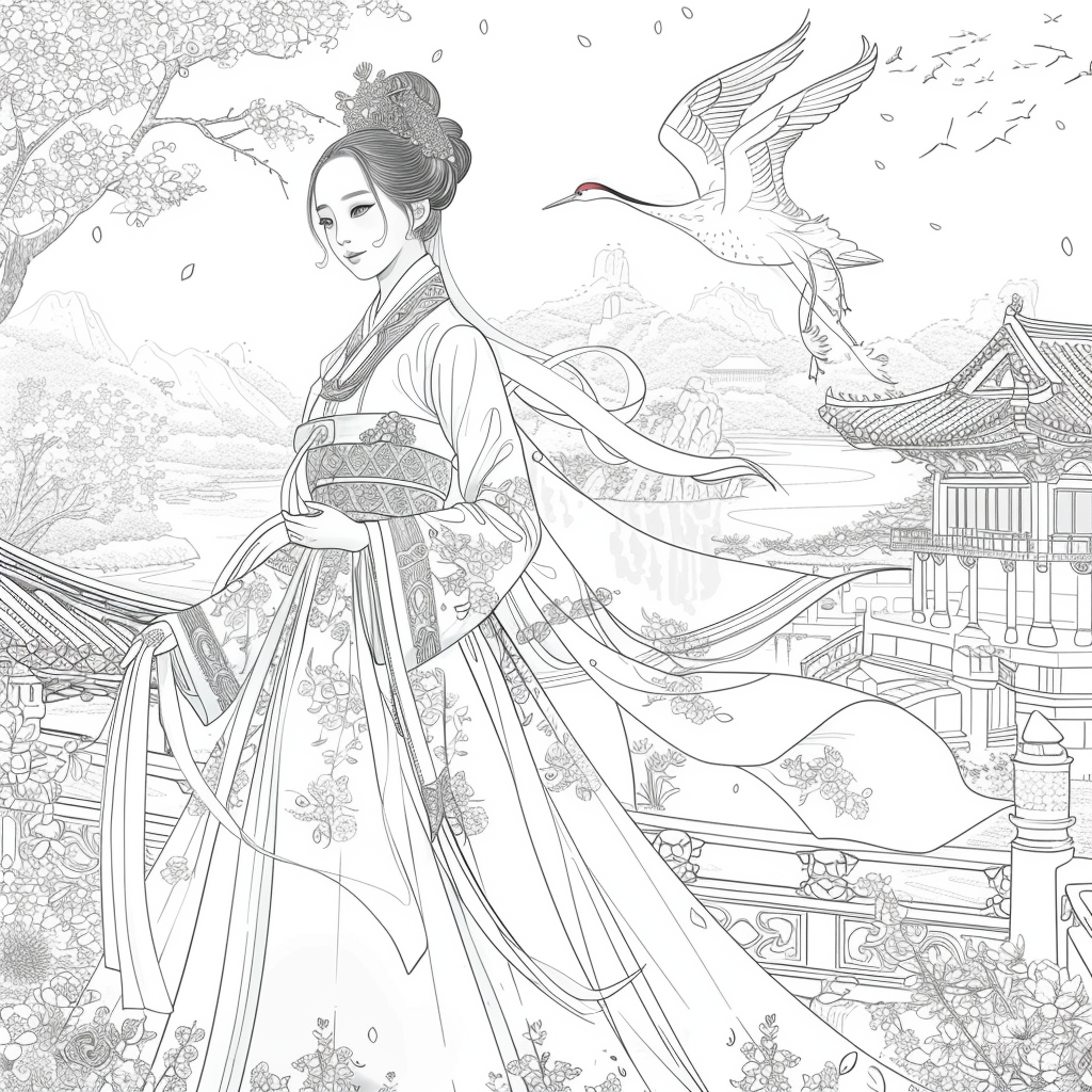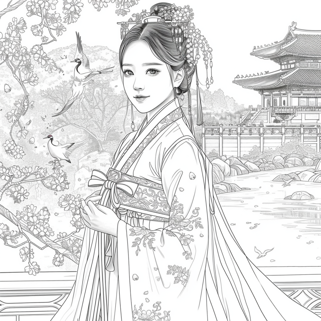 A graceful Korean lady in a flowing hanbok adorned with vivid floral patterns stands against the backdrop of a majestic palace and blooming cherry trees. Her gown cascades in brilliant shades of crimson, sapphire, and violet, each fold alive with intricate embroidery of blossoms and nature’s motifs. A white crane rises beside her, symbolizing longevity, purity, and freedom, while crimson petals drift gently in the air. The contrast of the detailed architecture and the dreamlike flow of her attire creates a balance between tradition and fantasy, embodying harmony, elegance, and timeless beauty.