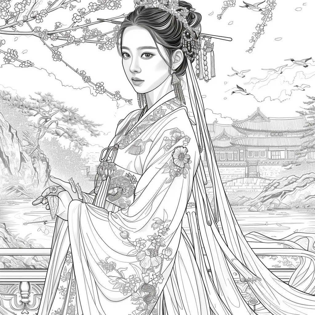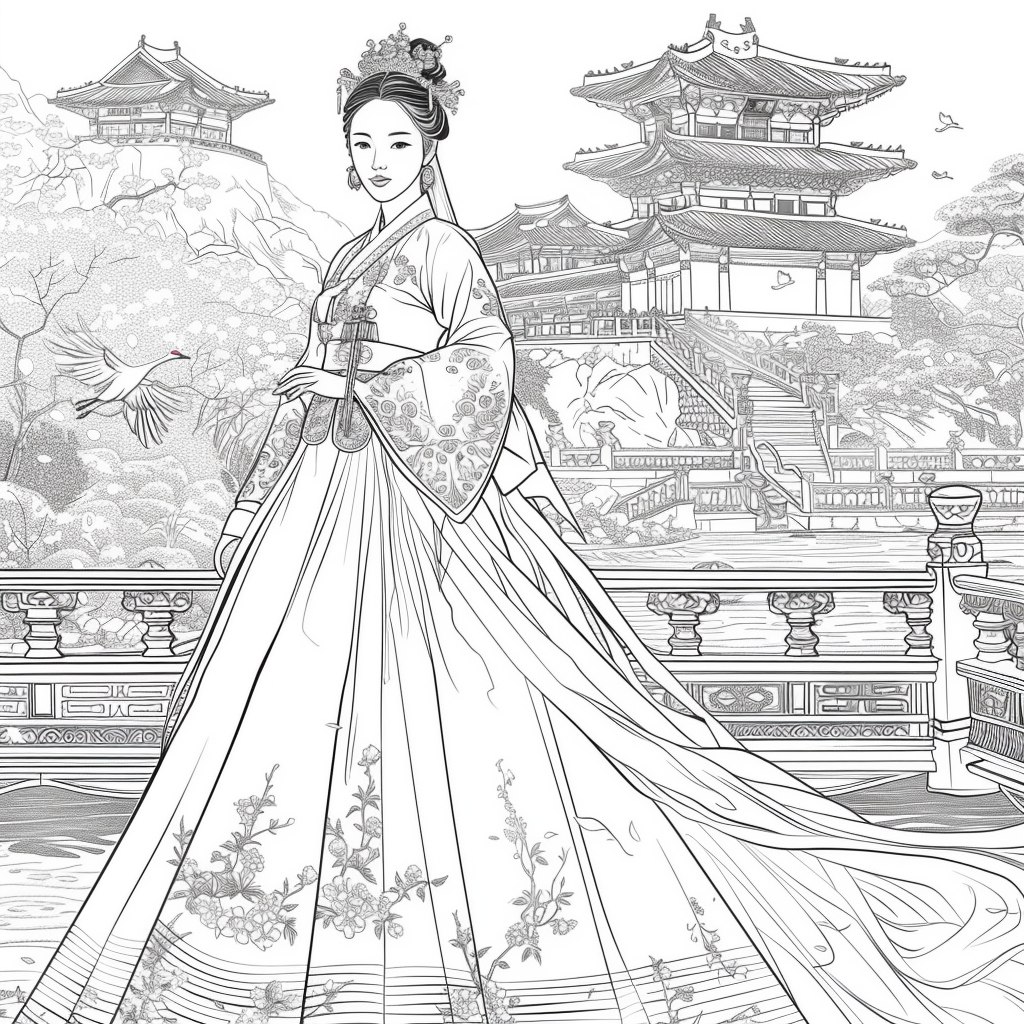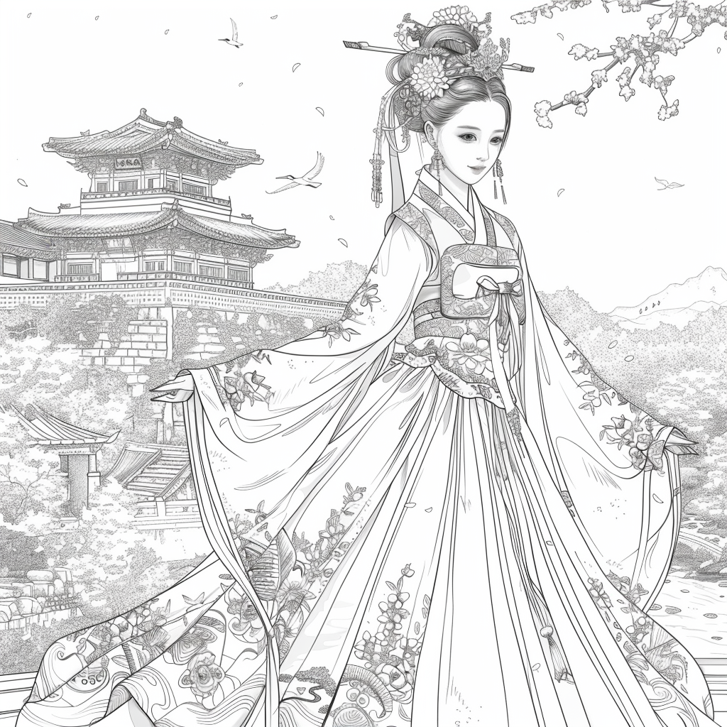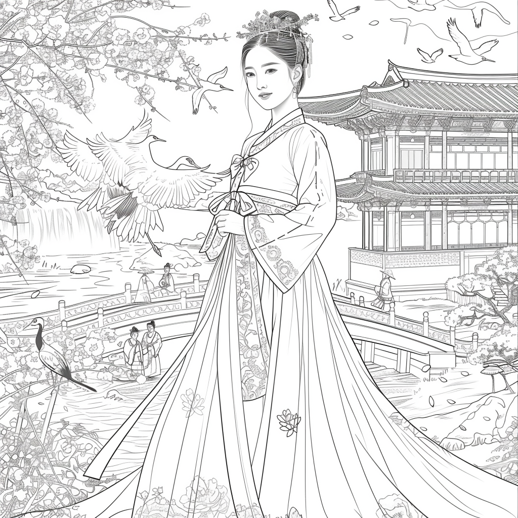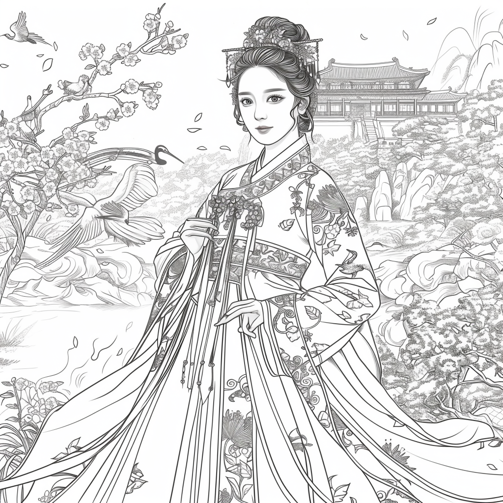 A graceful Korean lady in a flowing hanbok adorned with vivid floral patterns stands against the backdrop of a majestic palace and blooming cherry trees. Her gown cascades in brilliant shades of crimson, sapphire, and violet, each fold alive with intricate embroidery of blossoms and nature’s motifs. A white crane rises beside her, symbolizing longevity, purity, and freedom, while crimson petals drift gently in the air. The contrast of the detailed architecture and the dreamlike flow of her attire creates a balance between tradition and fantasy, embodying harmony, elegance, and timeless beauty.