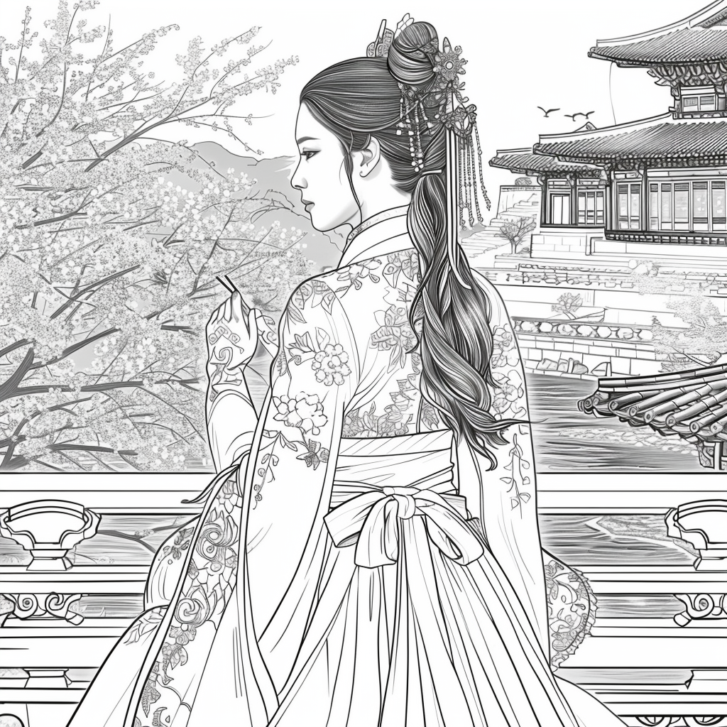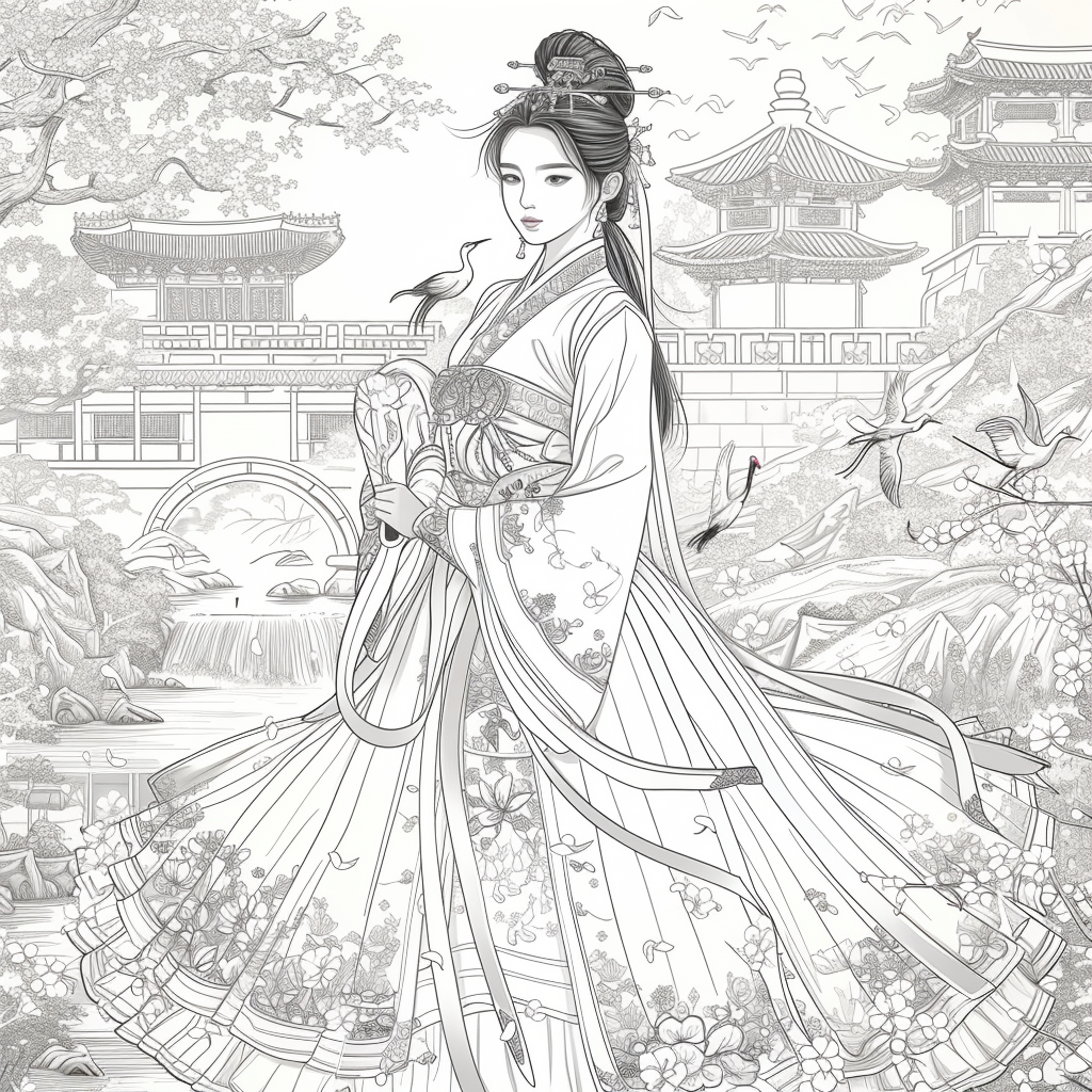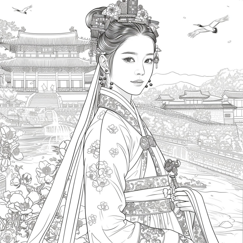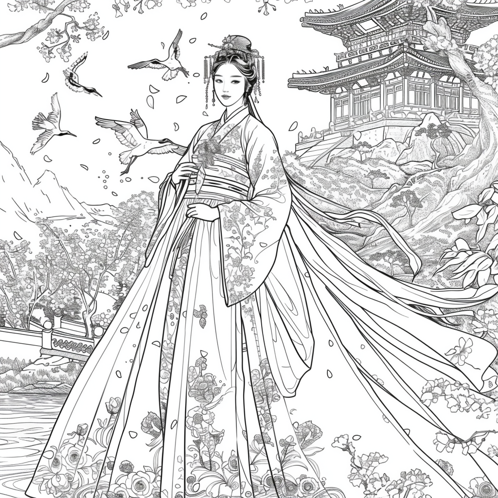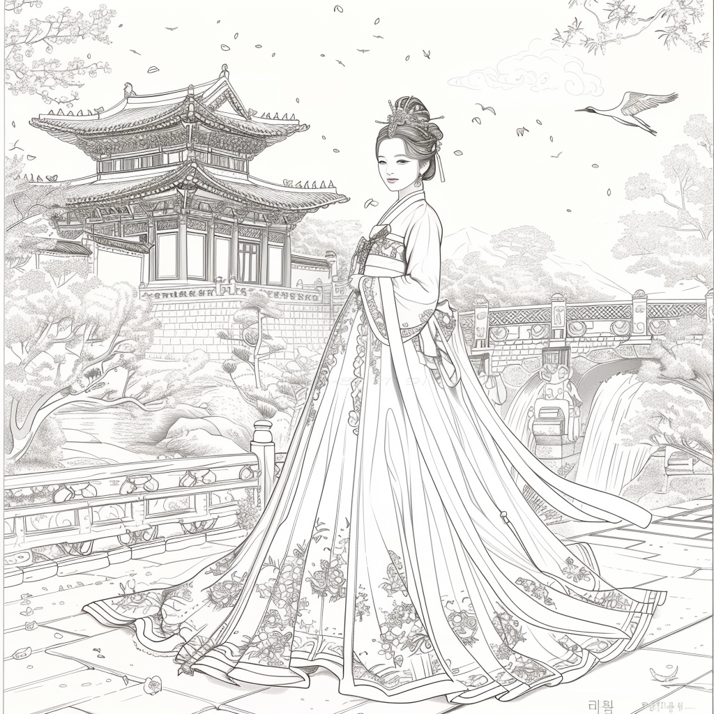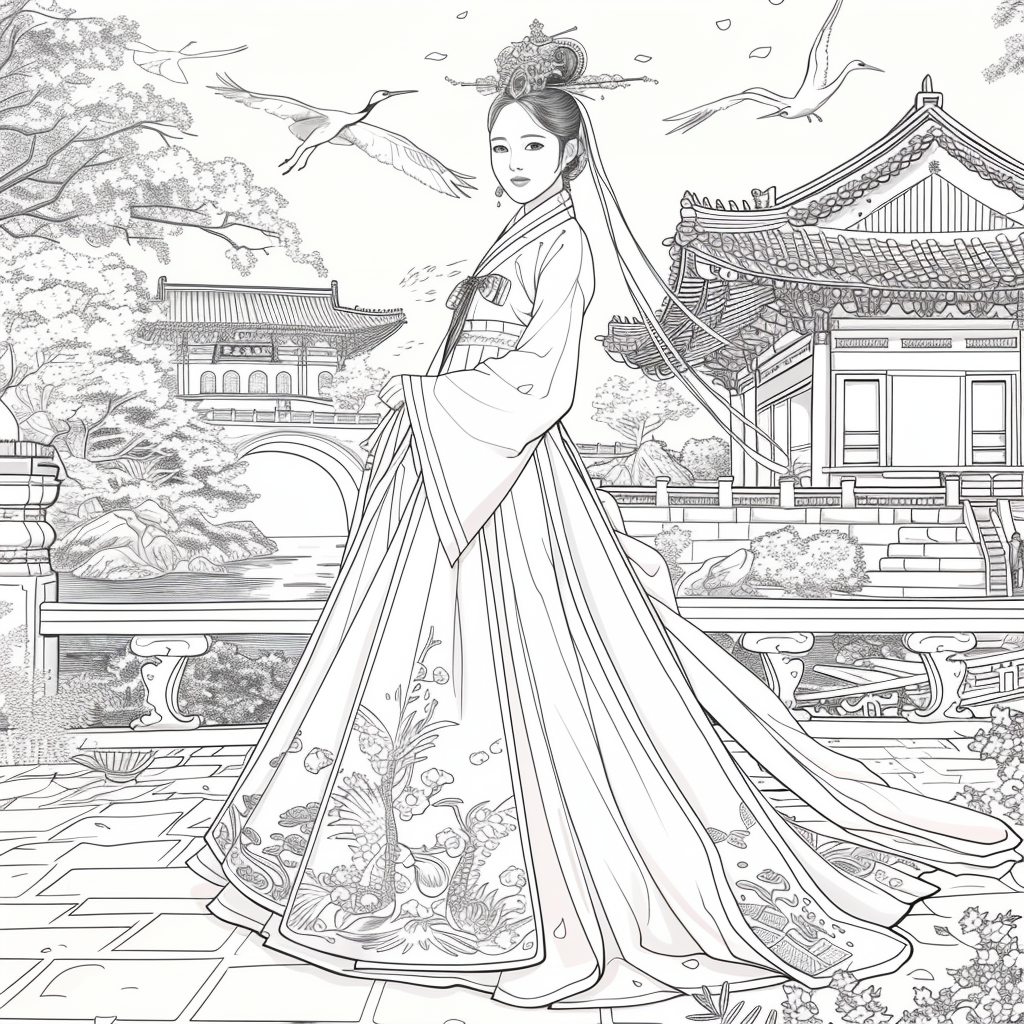 A graceful Korean lady in a flowing hanbok adorned with vivid floral patterns stands against the backdrop of a majestic palace and blooming cherry trees. Her gown cascades in brilliant shades of crimson, sapphire, and violet, each fold alive with intricate embroidery of blossoms and nature’s motifs. A white crane rises beside her, symbolizing longevity, purity, and freedom, while crimson petals drift gently in the air. The contrast of the detailed architecture and the dreamlike flow of her attire creates a balance between tradition and fantasy, embodying harmony, elegance, and timeless beauty.