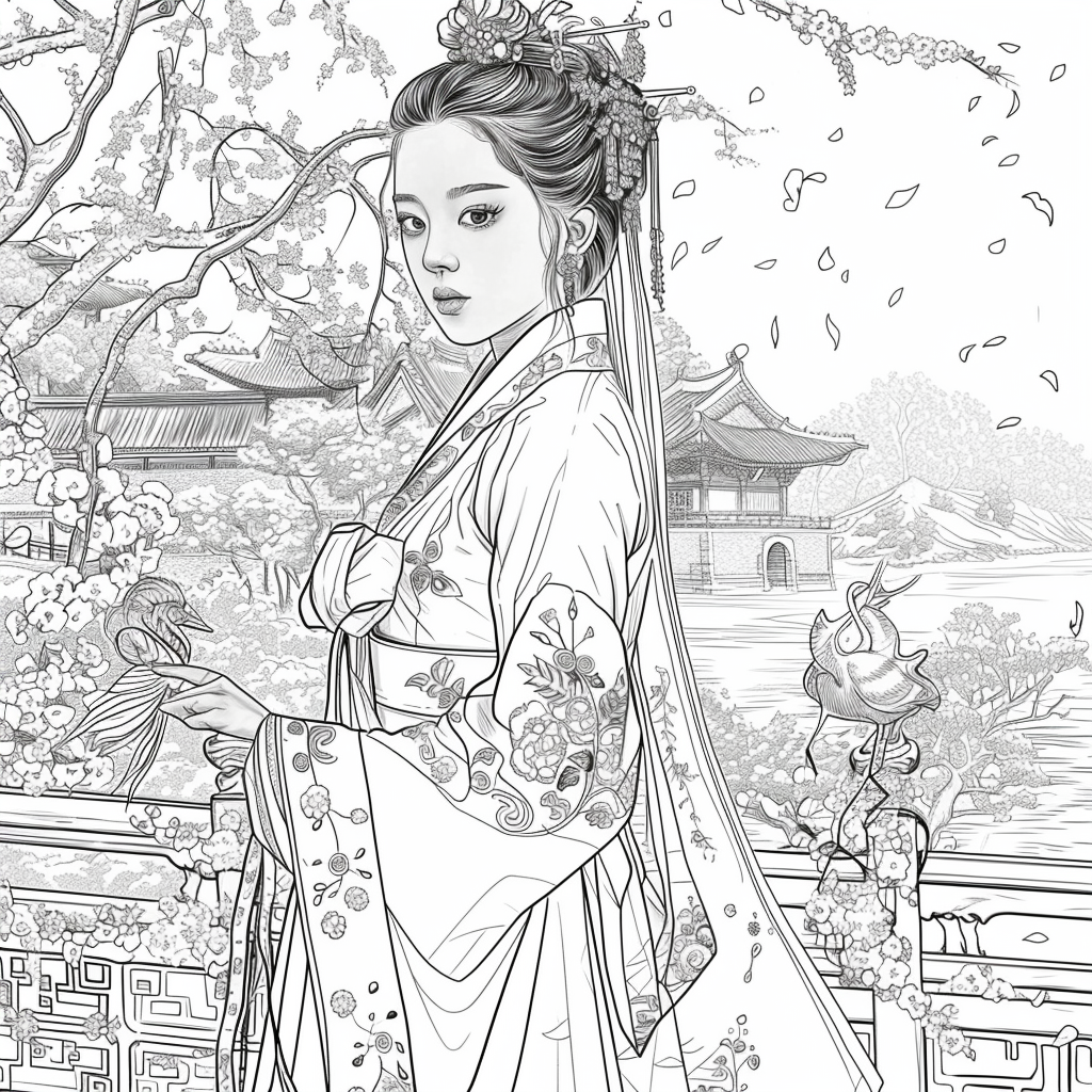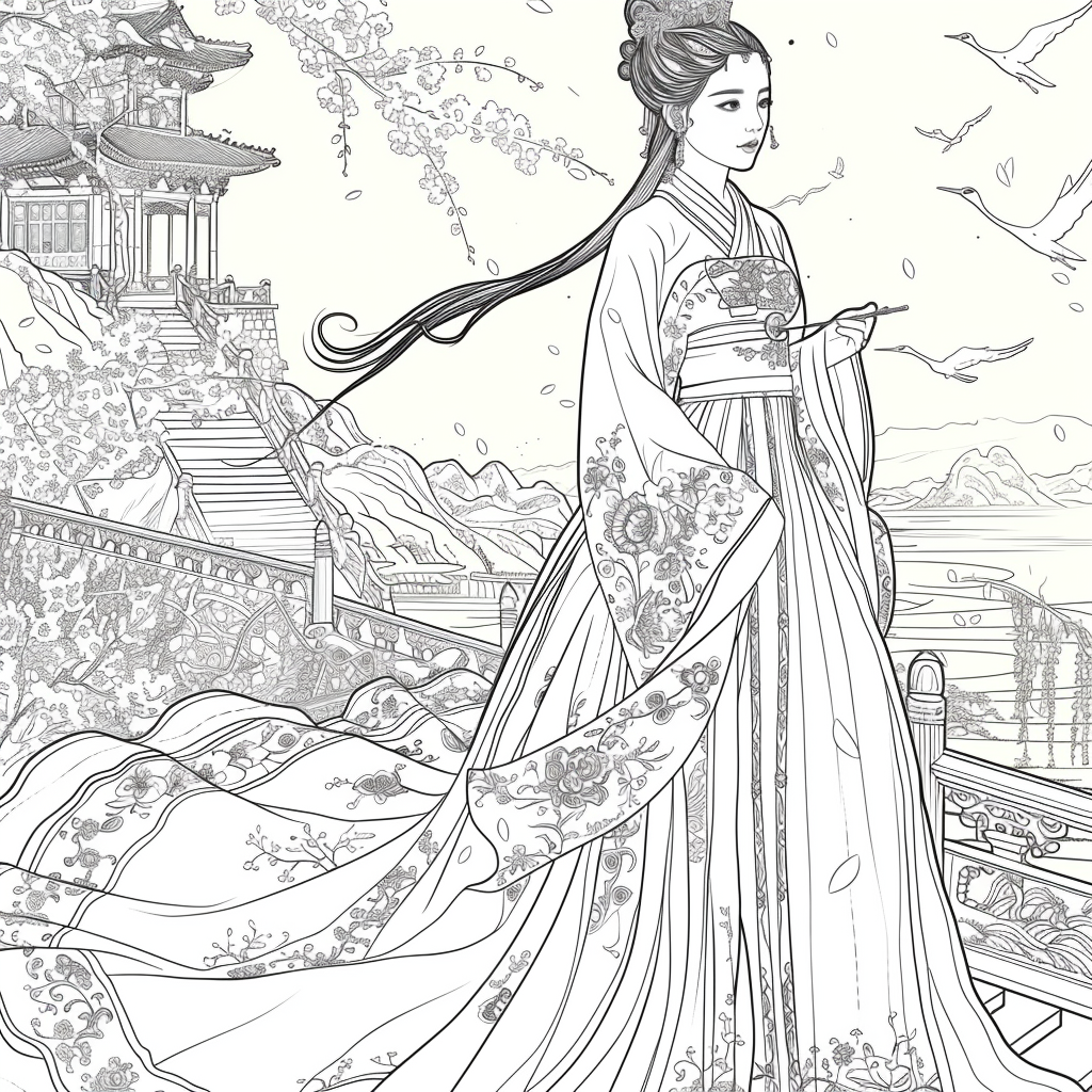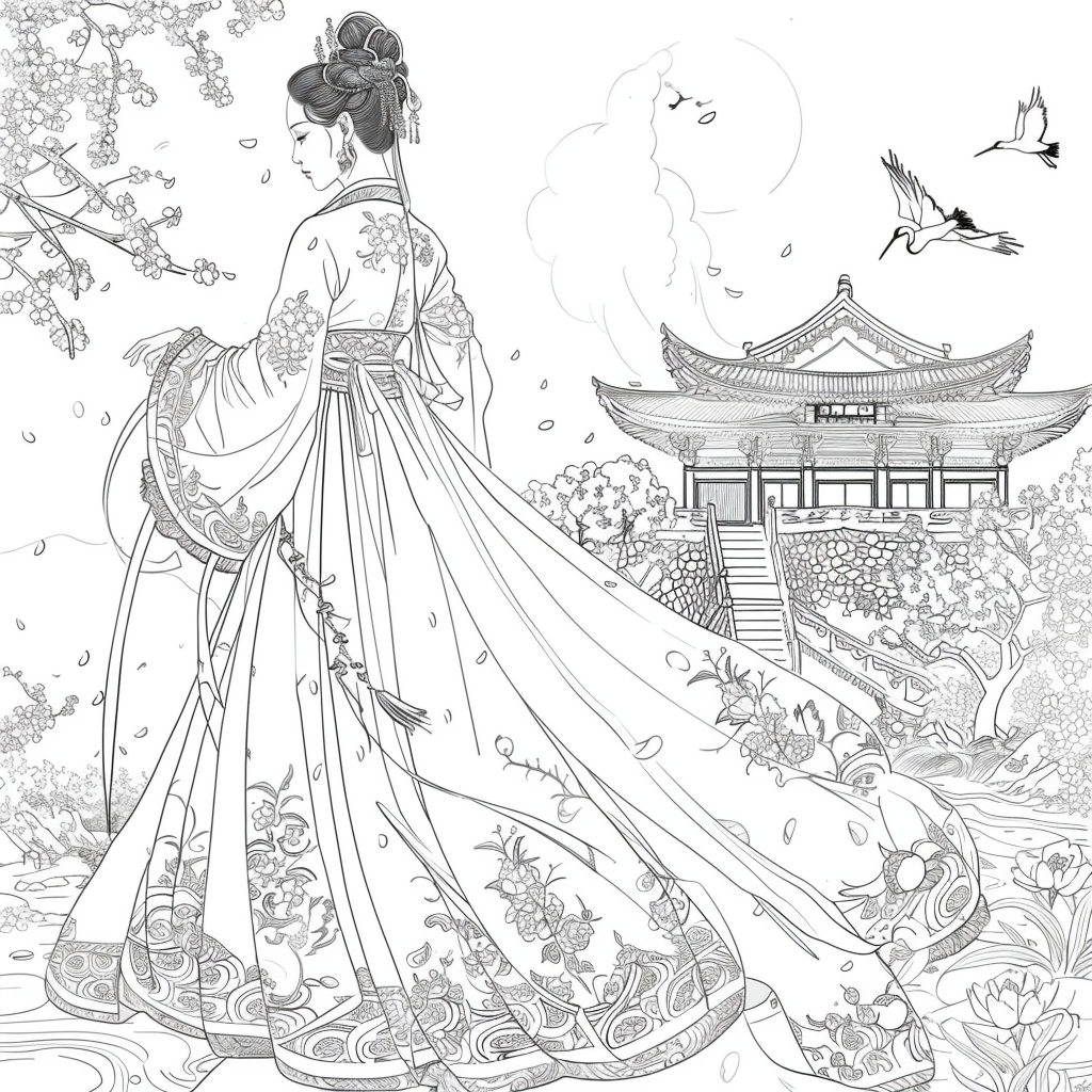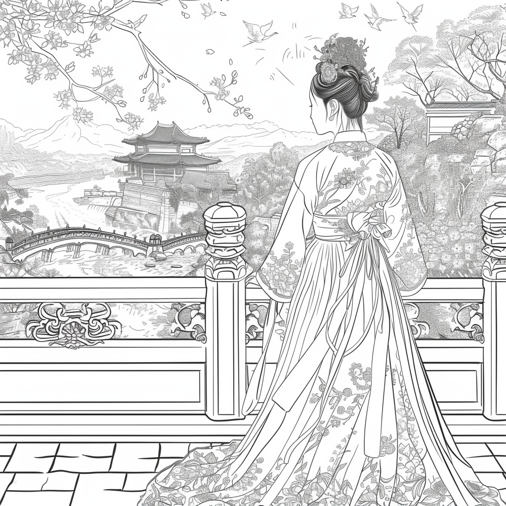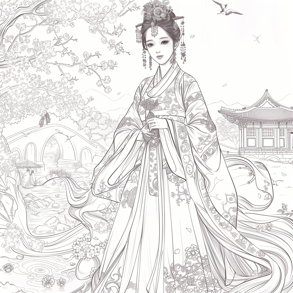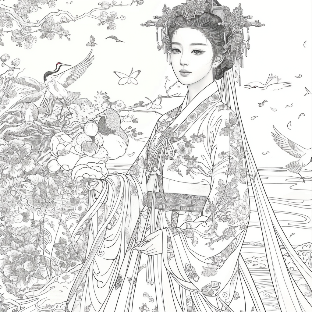 A graceful Korean lady in a flowing hanbok adorned with vivid floral patterns stands against the backdrop of a majestic palace and blooming cherry trees. Her gown cascades in brilliant shades of crimson, sapphire, and violet, each fold alive with intricate embroidery of blossoms and nature’s motifs. A white crane rises beside her, symbolizing longevity, purity, and freedom, while crimson petals drift gently in the air. The contrast of the detailed architecture and the dreamlike flow of her attire creates a balance between tradition and fantasy, embodying harmony, elegance, and timeless beauty.
